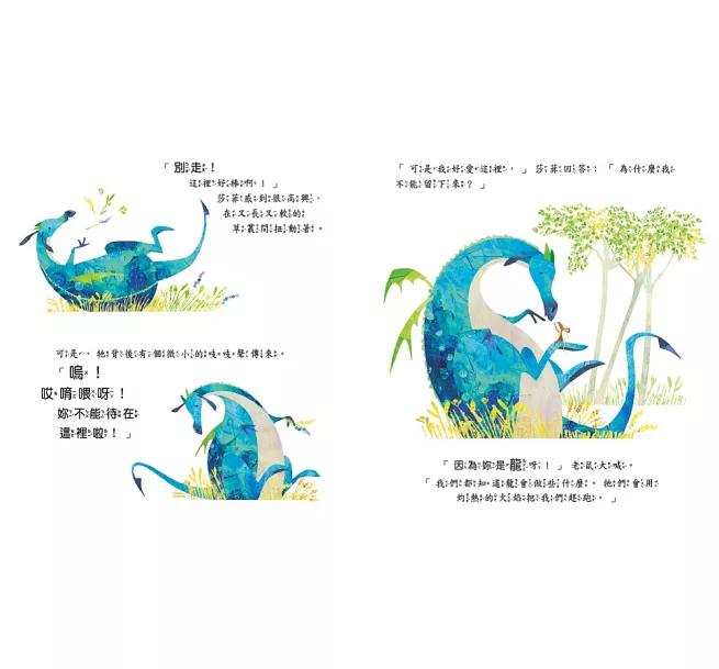 回到故事裡,劇情出現一大轉折,讓我們從心疼莎菲這個角色,轉而佩服起牠來──小動物們趕走心中畏懼的巨大噴火龍後,家園卻遭受到了真正兇惡的噴火龍群攻擊!這時尚未走遠的莎菲,並不因被拒絕而心懷憤恨,反而挺身而出,趕走了可怕的惡龍群,勇敢地保衛了牠所認定的「朋友」們,最後還帶大家找到了一個新的美麗家園。這樣包容與勇敢的表現,讓讀者體會到愛和感動,而動物們自我反省後的致歉,也值得引導孩子借鏡,面對願意與自己真心結交的新朋友,伸出友誼的手永遠不嫌遲。